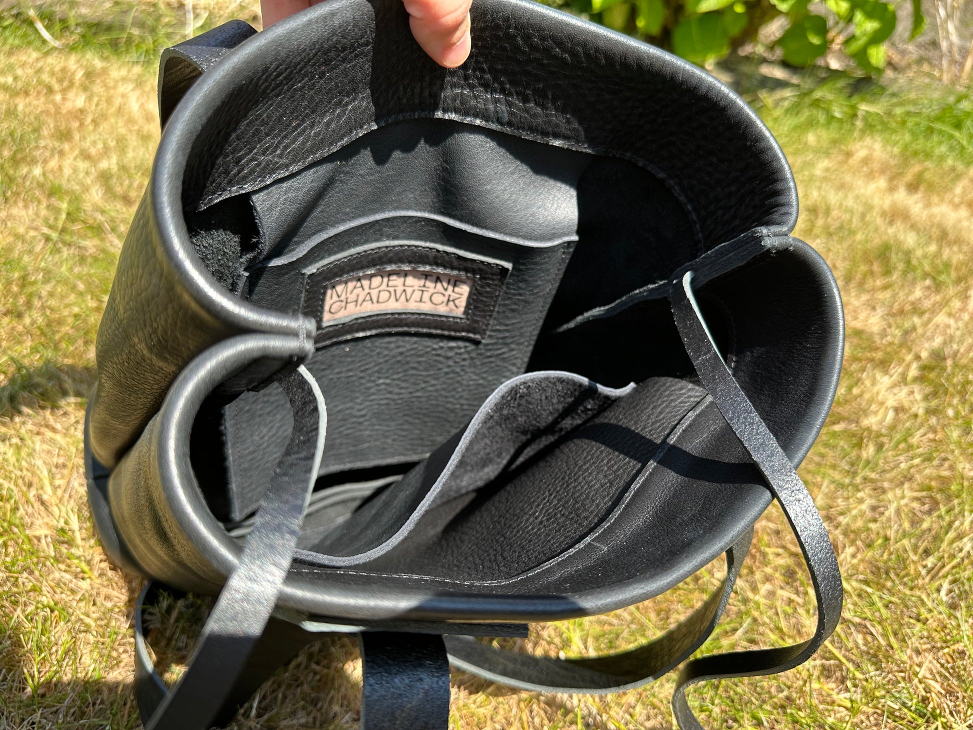 Unlined, two open interior pockets, with a leather tie closure at the top.